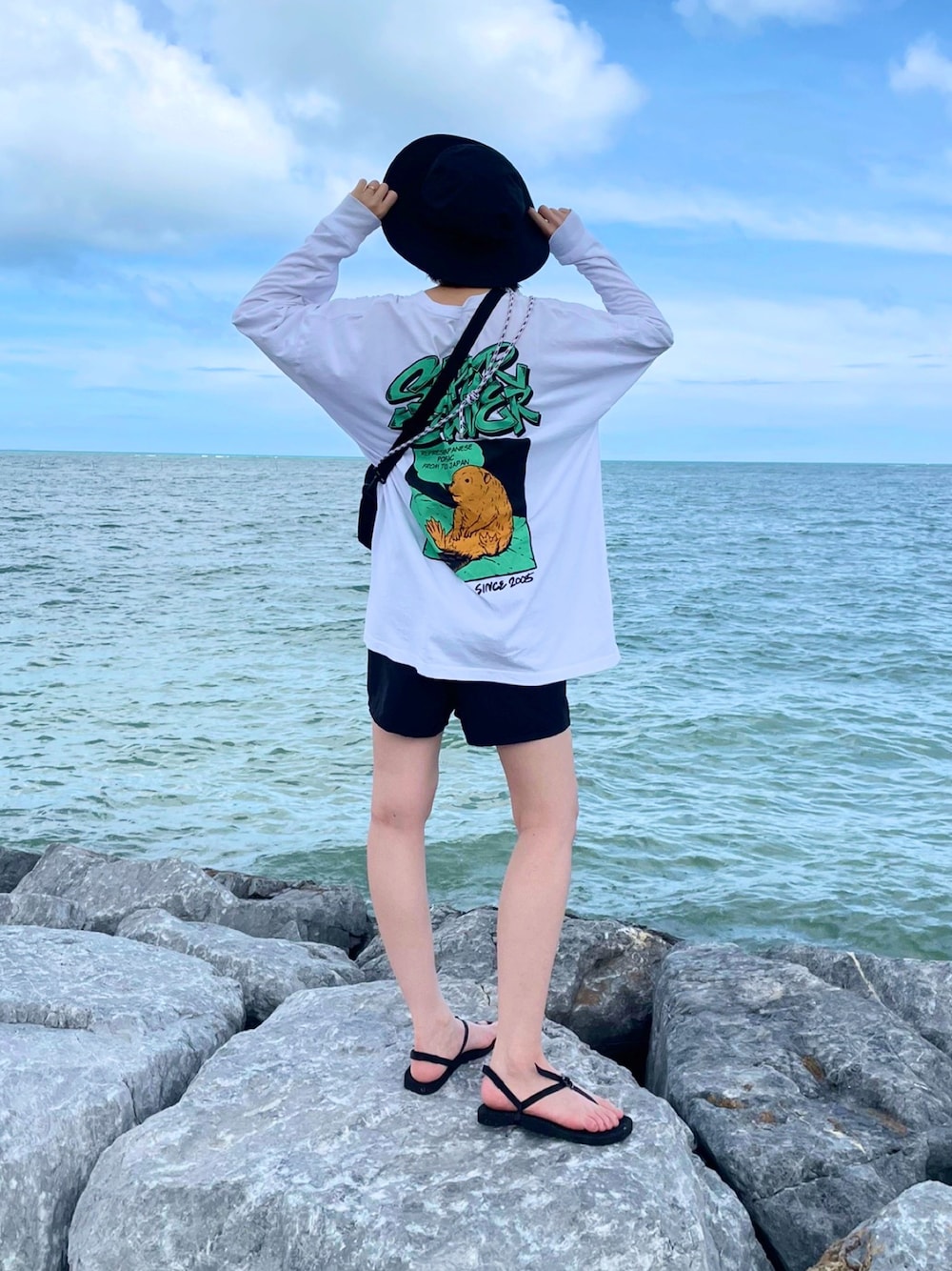 めんそーれ。女方です🌞 6月に沖縄へ訪れた際のスタイルです。 梅雨明け直前でムシッとした気候だったのですが、どうしても ロングTシャツとショーツとサンダル のスタイルがしたくて強行突破しました😂 SUPER BEAVERのこのTシャツのデザインが大好きで、この組み合わせはお気に入りです。 キャンプやフェスなどにも合いますよね〜😊 パタゴニアのショーツはシャカシャカした素材で、多少の水は弾くので、アウトドアには持ってこいです🏖 追伸: ダボダボTなので腕が捲りやすく、通気性も良いので暑くなりにくい、と勝手に思い込んでます。