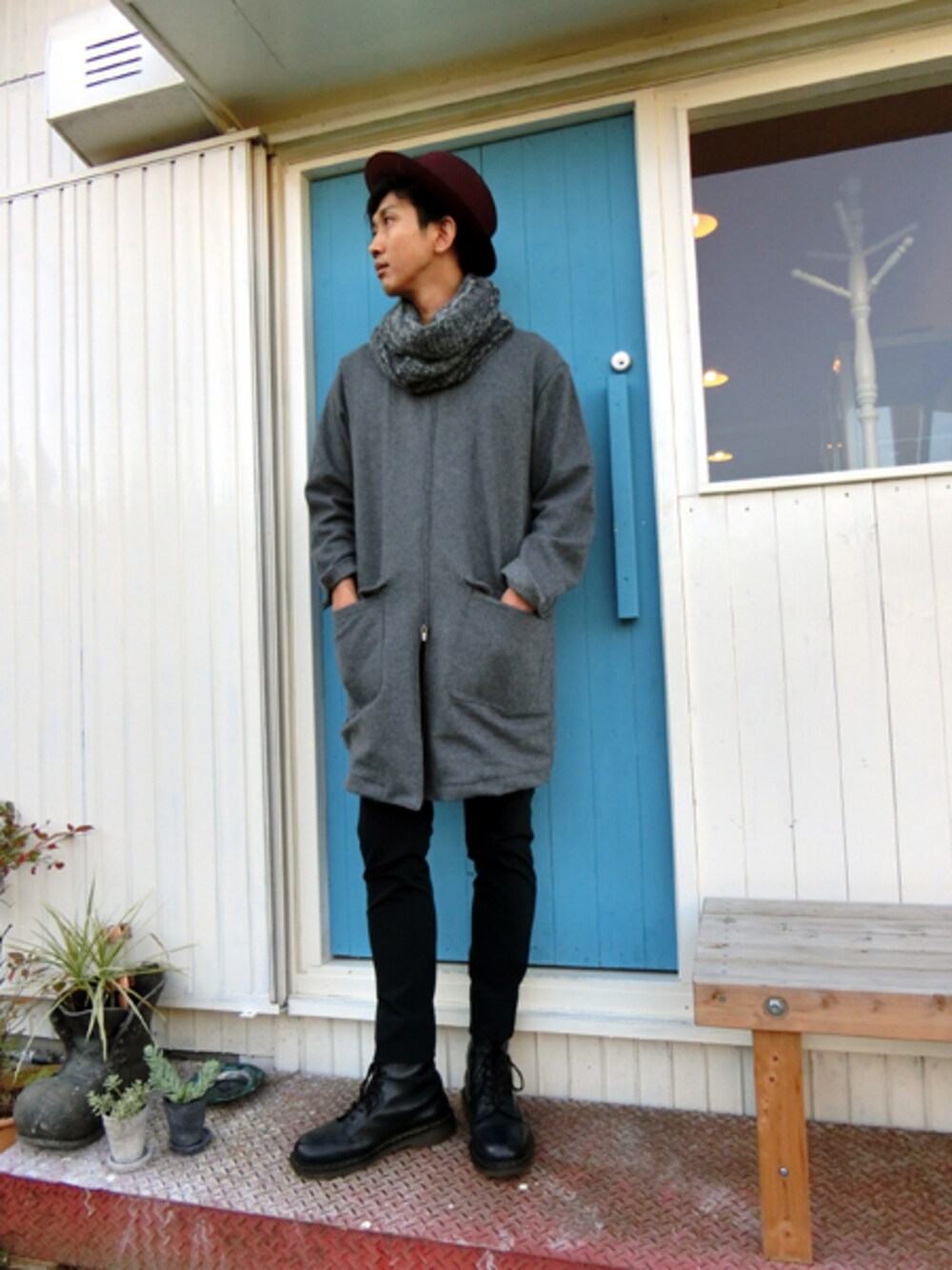 メルトンの様な素材を使用したノーカラーコートは袖口裏、見返しに同素材のピンストライプを使用。ネイビーのジャージスキニースラックスと同色のマーチン8ホール。首回りにはノーカラーのコートなのでタートル風にネックウォーマーを着けています。