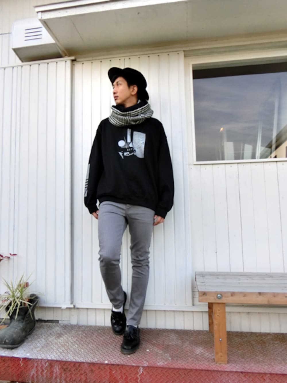 スウェットをゆったりと着たブラック×グレーのモノトーン系コーデ