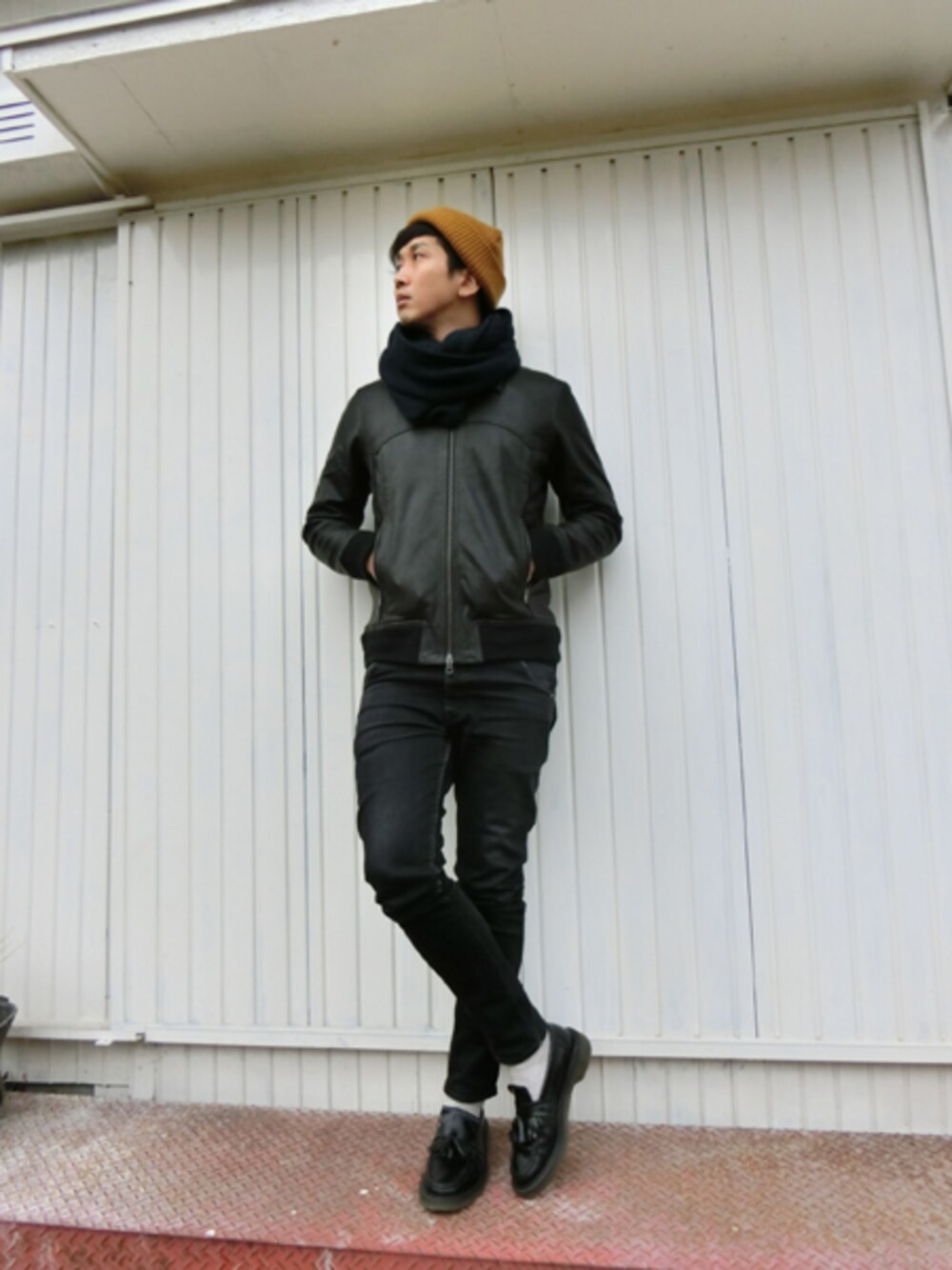 シンプルで上質なラムレザーにスヌードを巻いたブラック系コーデ