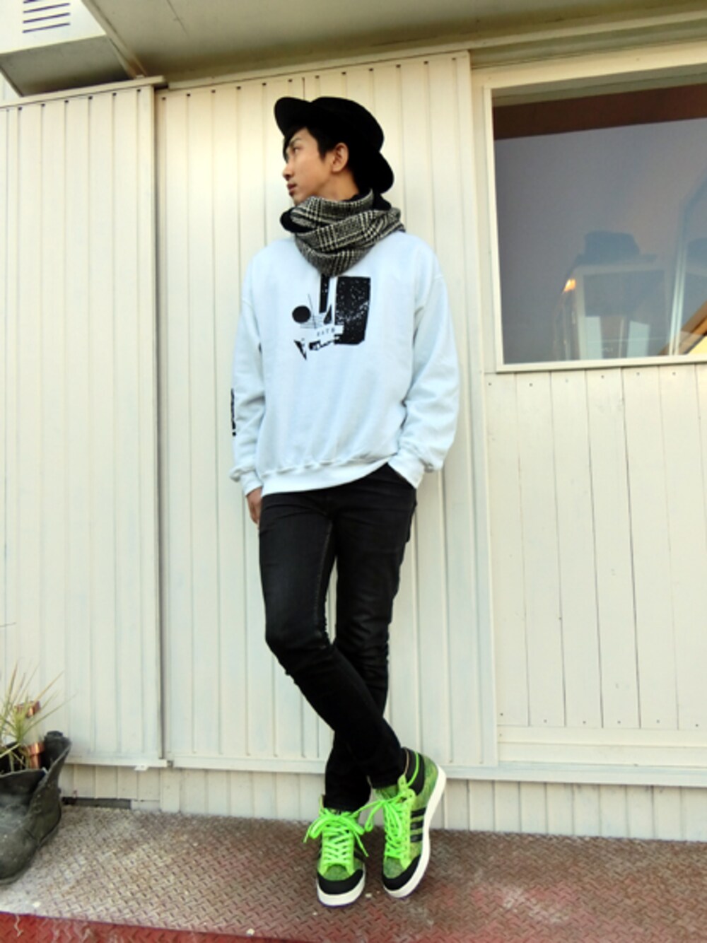 ホワイトのスウェットにスヌードをプラス、ブラックスキニー&ブラックハット、足元は超派手に (*^^)v