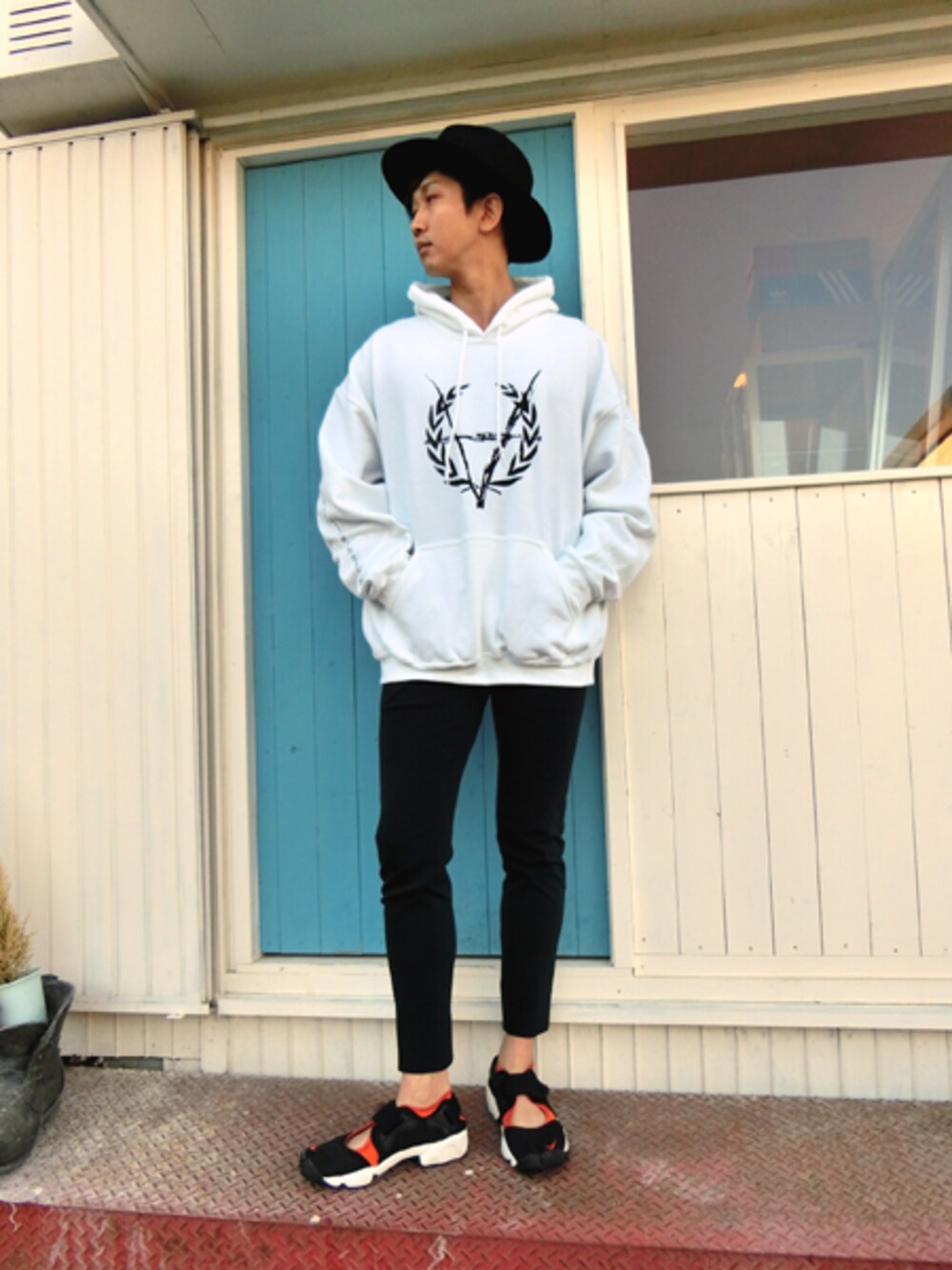 ゆったりとXLサイズで着たホワイトのパーカーに、ロングブリムHAT、ネイビーのスリムジャージパンツに合わせた足元はナイキの足袋型スニーカーのエアリフト。