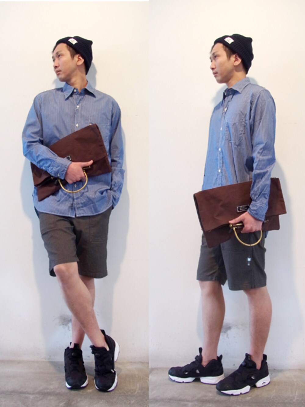 ストライプシャツにショーツを合わせて、足元のスニーカーで外しつつ、クラッチバッグを持ったコーディネートです。