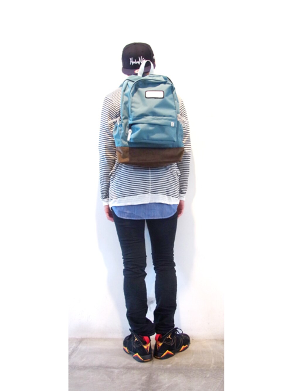 キャップ、バックパックを引き立たせるバックからのショット!ボーダーカーディガンからストライプシャツがチラ見えさせて、ブラックの細身パンツがゴツめのスニーカーのバランスを良く見せています。
