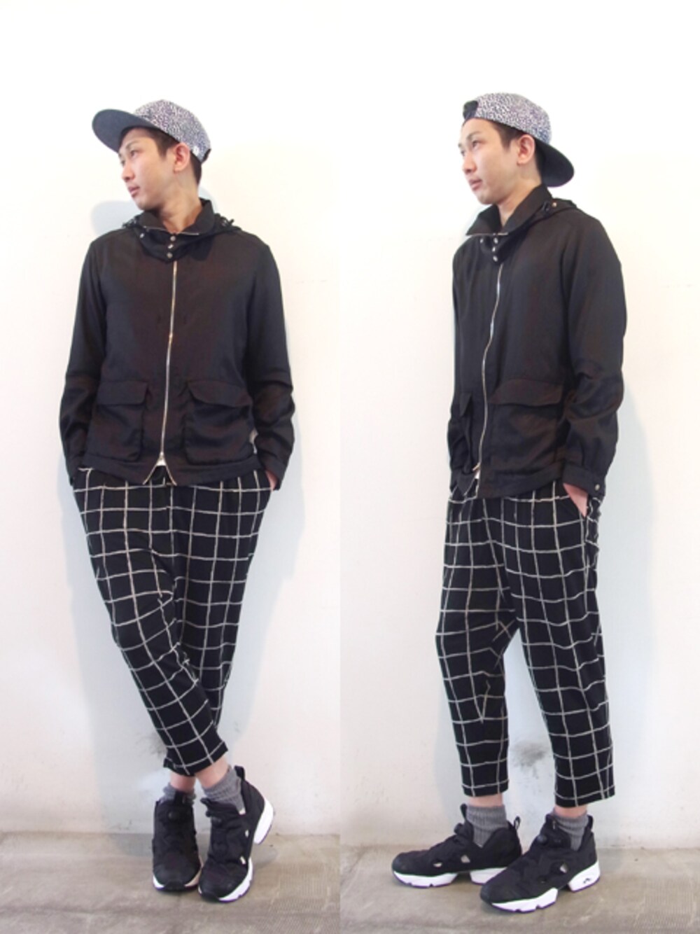 薄手のシャツ生地のマウンテンパーカータイプのJKにウィンドーペンチェックのストレッチサルエルパンツを合わせて足元はハイテクスニーカー、ヒョウ柄のキャップでまとめてみました。