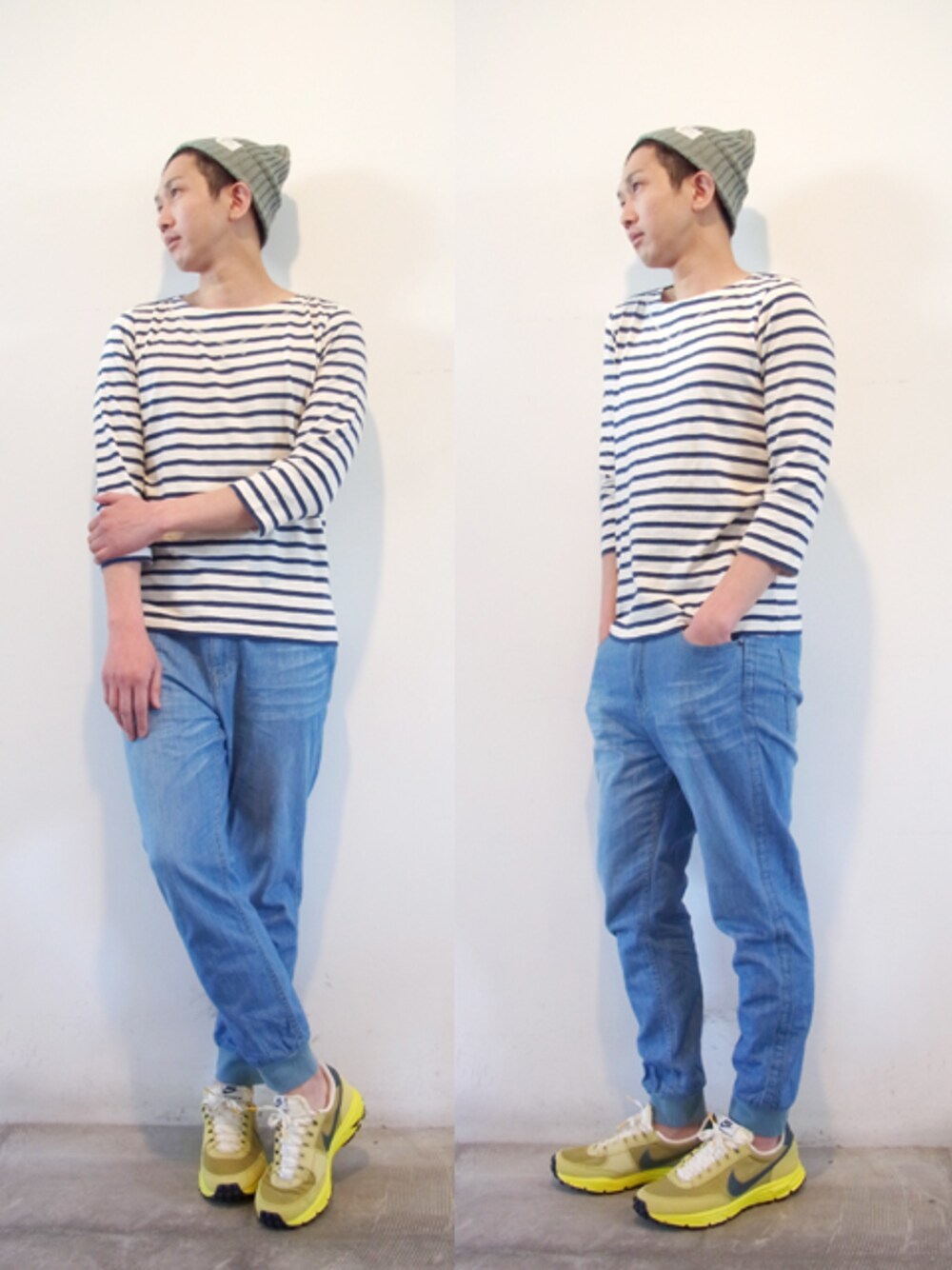デニムのリブパンツにボーダーのカットソー、グレーのワッチキャップに、足元はイエローのスニーカーで春らしいカラーリングとアイテムを使っています。