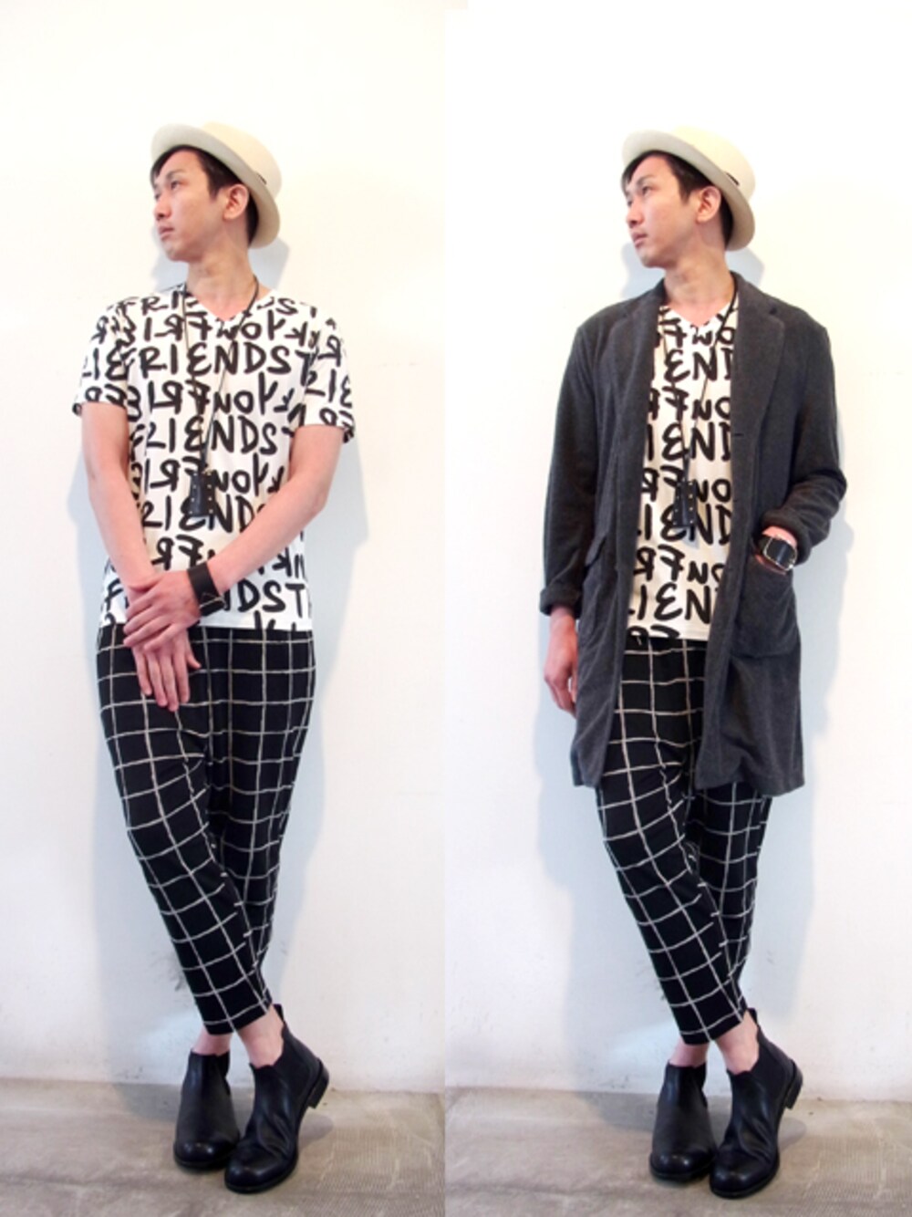 チェックのパンツと柄物のTシャツを合わせて、首にレザーキーケースを掛けてアクセントにしています。足元はサイドゴアブーツ、パイルのコートを着たバージョンも撮影しています。ネックレス風に使ったレザーキーケースがアクセントです!