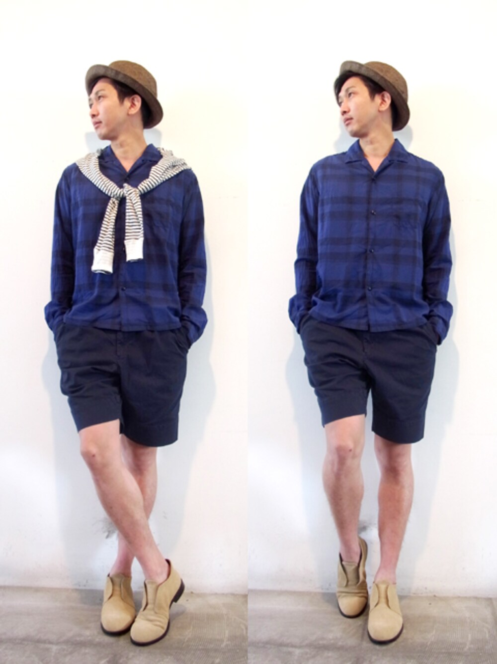 ブルーのチェックシャツにネイビーのショーツを合わせて足元はベージュのスウェードシューズ、ブラウンのHATでカジュアルに、肩にボーダーカーディガンを掛けたスタイルも追加しました