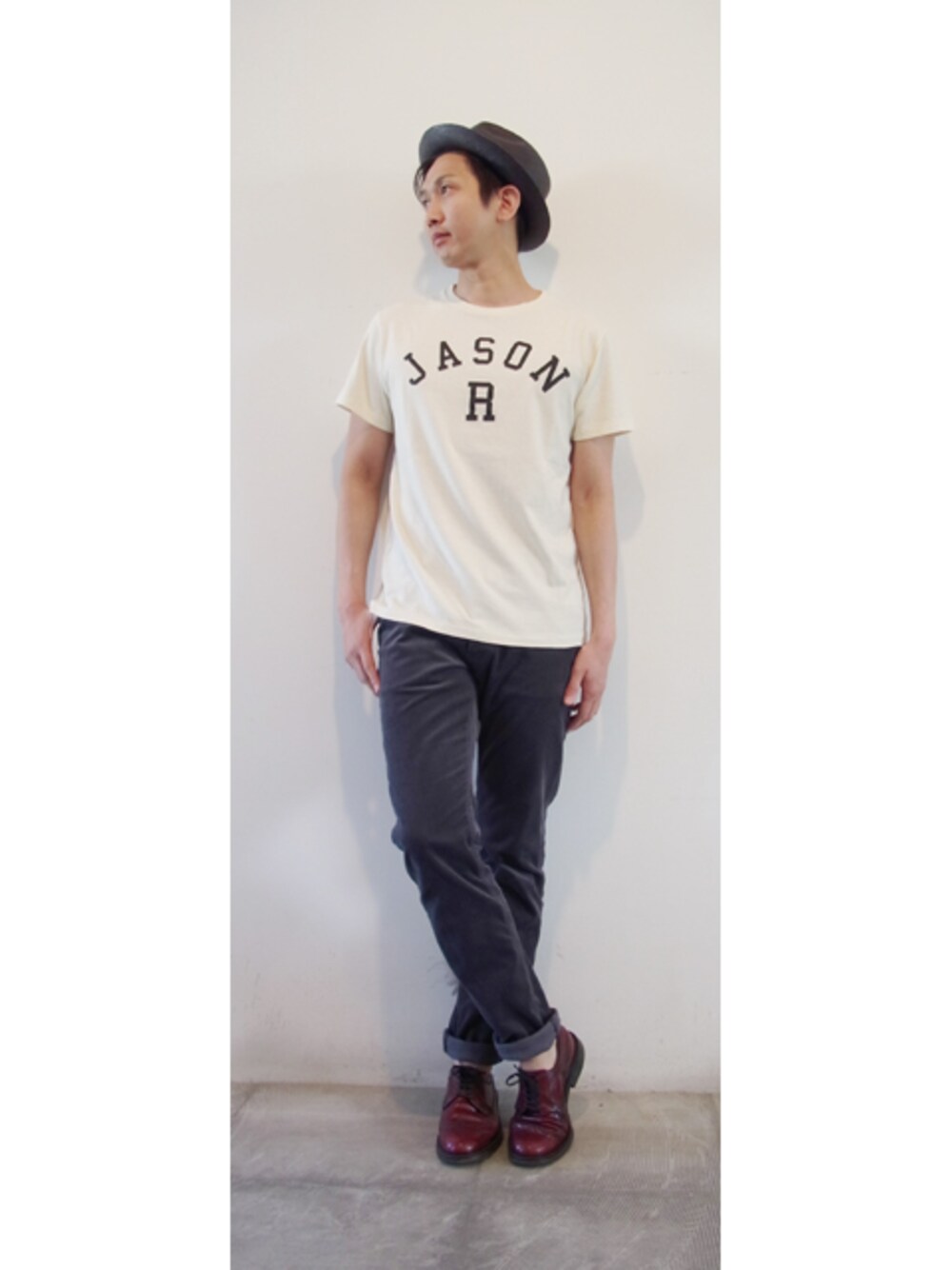 シンプルなプリントのTシャツをコーデュロイパンツとHATで合わせて大人なカンジでスッキリとまとめてみました。