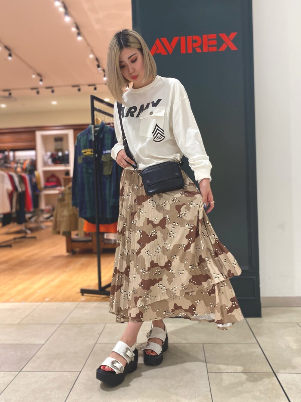 新作のカモフラスカートは レイヤーが入っていてとてもオシャレ☆ ウエストがゴムになっているので 楽ちんですよ〜♪ TEL: 080-4959-2370 2020.8.27 AVIREXコクーンシティ店STYLE