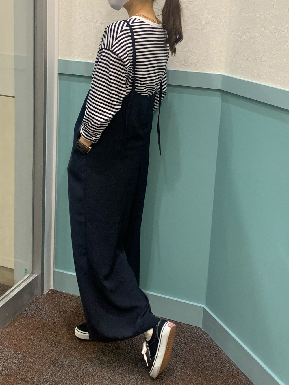 アメホリのサロペットは動きやすい・楽・体型カバーができるからほんとに優秀! ネイビーサロペットにネイビーのボーダートップスを合わせて統一感を出した感じ! リラックスして着れる服っていいよね♪