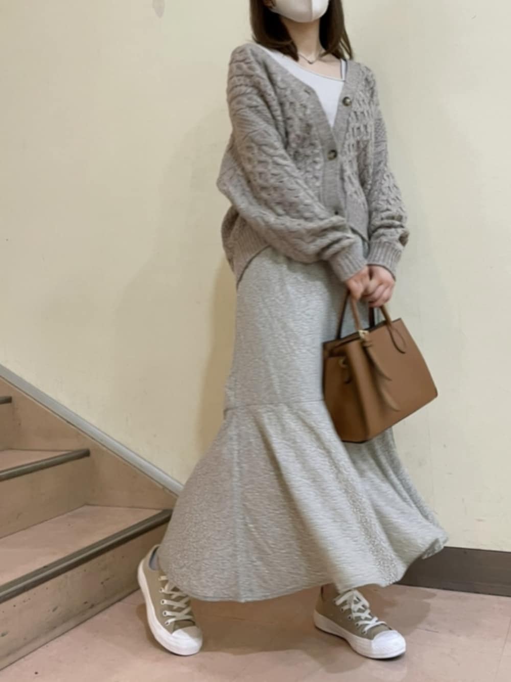 【淡色甘めベージュコーデ】 ベージュで合わせたワントーンコーデの女の子らしいバージョン🤎🤍 ちょっと鎖骨が見えるタンクトップで女性らしさを出しつつダボっと大きめのカーディガンで可愛らしさを出した〜! アースのスカートがほんとにシルエット良すぎてる😂✨ マーメイドのシルエットが綺麗に出るこのスカートは体型カバーにも優れてるよ🌼🌼 最後はメリハリを出すために濃い色のブラウンバックできめてる〜! 秋はベージュコーデ最高だね😉🍁🍁