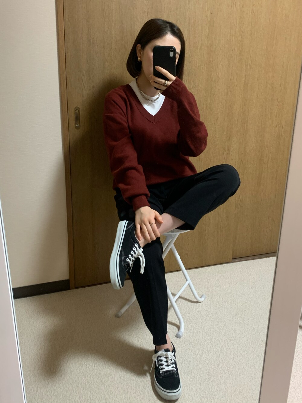 シンプルに赤ニットと白Tのレイヤードコーデ 男の子っぽいボーイッシュなコーデ 最近ショートカットにしたからかっこよくてシンプルな格好が多くなってくる🤭🖤 赤ニットだけど赤すぎない濃いめの暗い赤ってかっこいいよね、、 バンズは安定に決めれるから本当好き 来年もいっぱい自分らしいおしゃれしたい〜