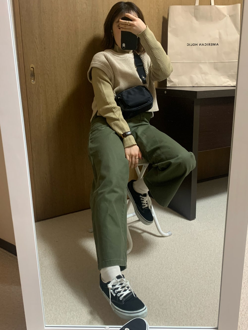 ニットベストとニット合わせで着てるんやけど実はこれセットワンピースのベストなんよ🦺🧡 アースカラーで合わせてるから統一感あって◎ ベージュもカーキはほんっとに似合う色だよね可愛いすき🥰💕