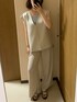 セットアップコーデ ライトベージュで女性らしい大人コーデの出来上がり〜✨ これ実はセットアップ商品じゃなくてセットアップもどきのコーデになってる! トップスもパンツも両方プチプラだから最高🥺💕 淡すぎる色だから靴とメガネで色をしてめるよ❤︎
