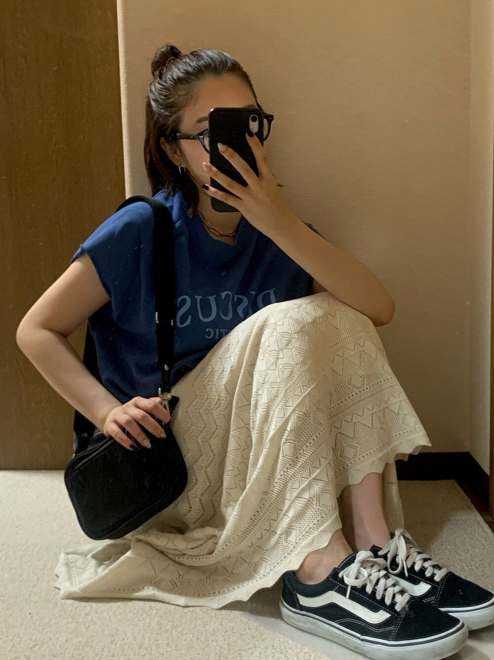 カジュアルコーデ💙 今日も全身アメホリコーデ🤚 レーススカートに青のロゴTをチョイス! バックと靴、メガネは黒で締めて可愛くなりすぎないカジュアルコーデ! このロゴスウェットめちゃくちゃ肌触りが良くて気持ちがいいの〜!