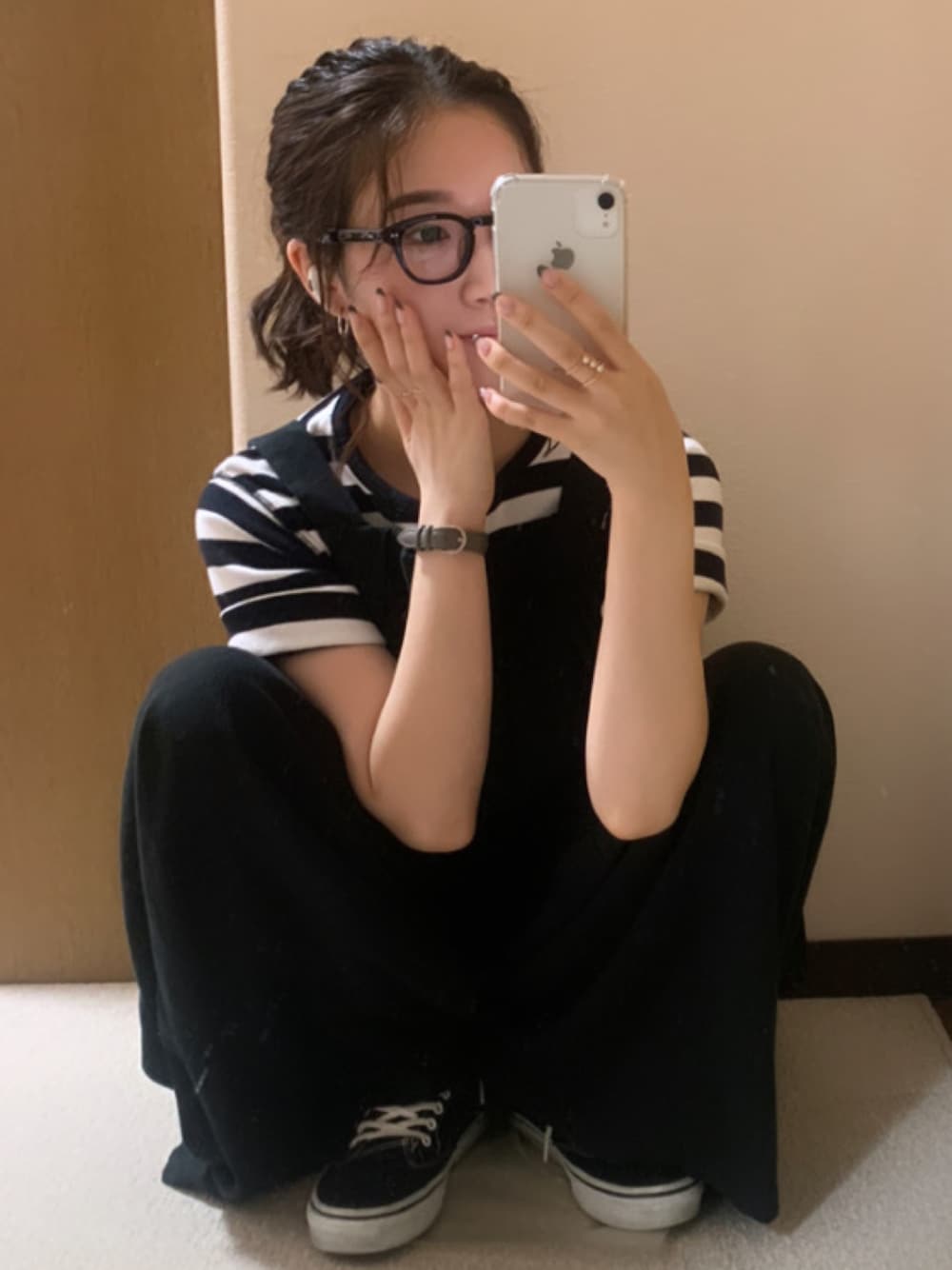 モノトーンサロペットコーデ🤍🖤 アメホリのバックリボンサロペットが可愛すぎてたの〜!! 横幅が大きい分ゆるっとシルエットで可愛らしい印象に◎ トップスのリブも安いのに高見えな生地でしっかりしてるよ〜! ゆるっとリラックスして着れるサロペットは優秀だあ✨✨