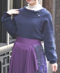 アステリズムシリーズにブルゾンを合わせたきれいめコーデです。刺繍の映えるネイビーのニットに抑えたカラーリングは上品な雰囲気。首元のビジューや星のボタンが煌めきノーアクセでも華やかです。
