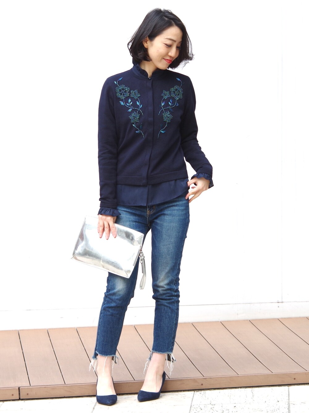 甘めのスタンドフリルのブラウスにカーディガンを重ねて大人カジュアルな着こなしにしてみました♡