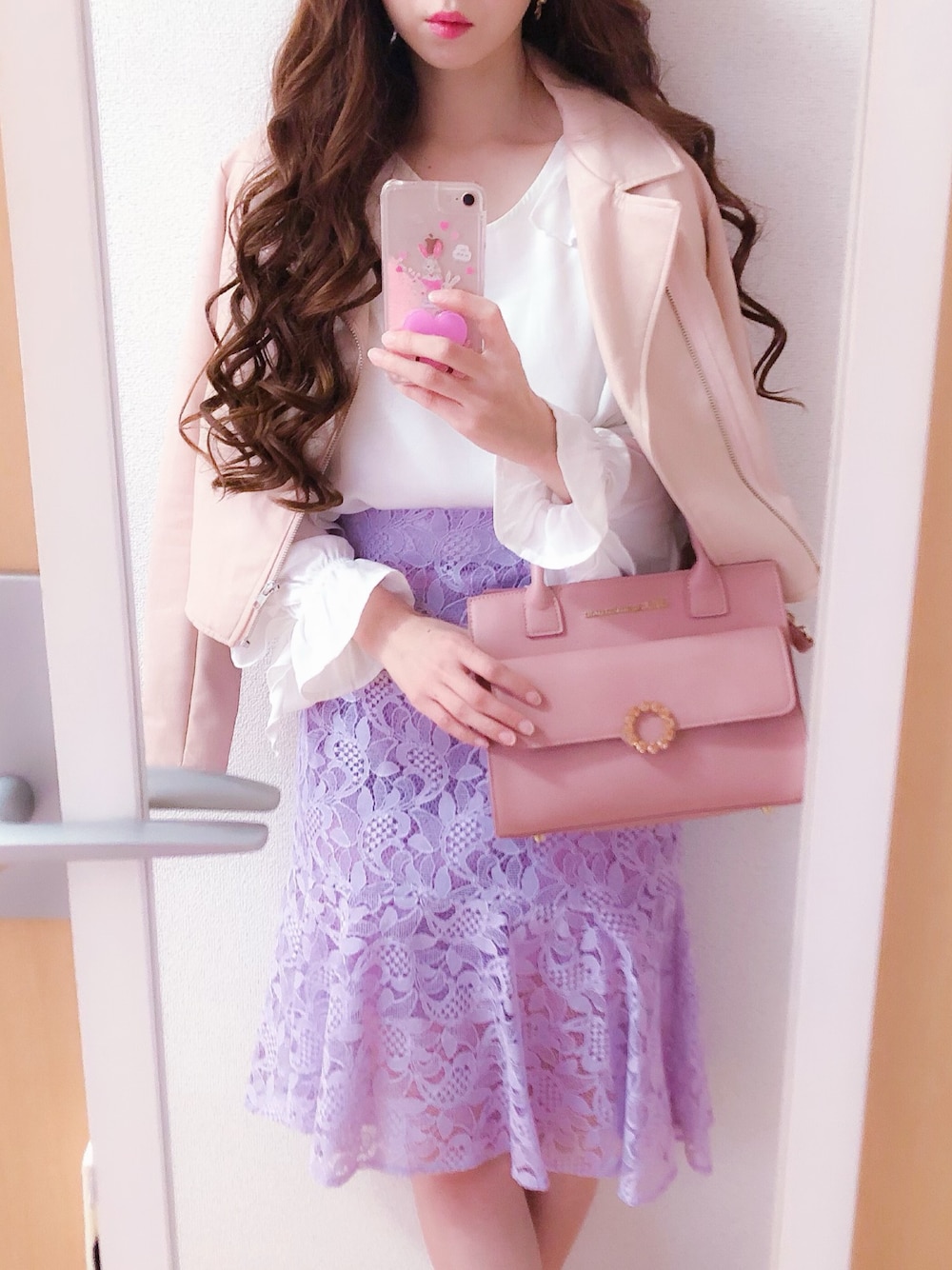 プルミンのラベンダースカートがお気に入りで合わせたコーデ💓ライダースがピンクやから甘めに💗