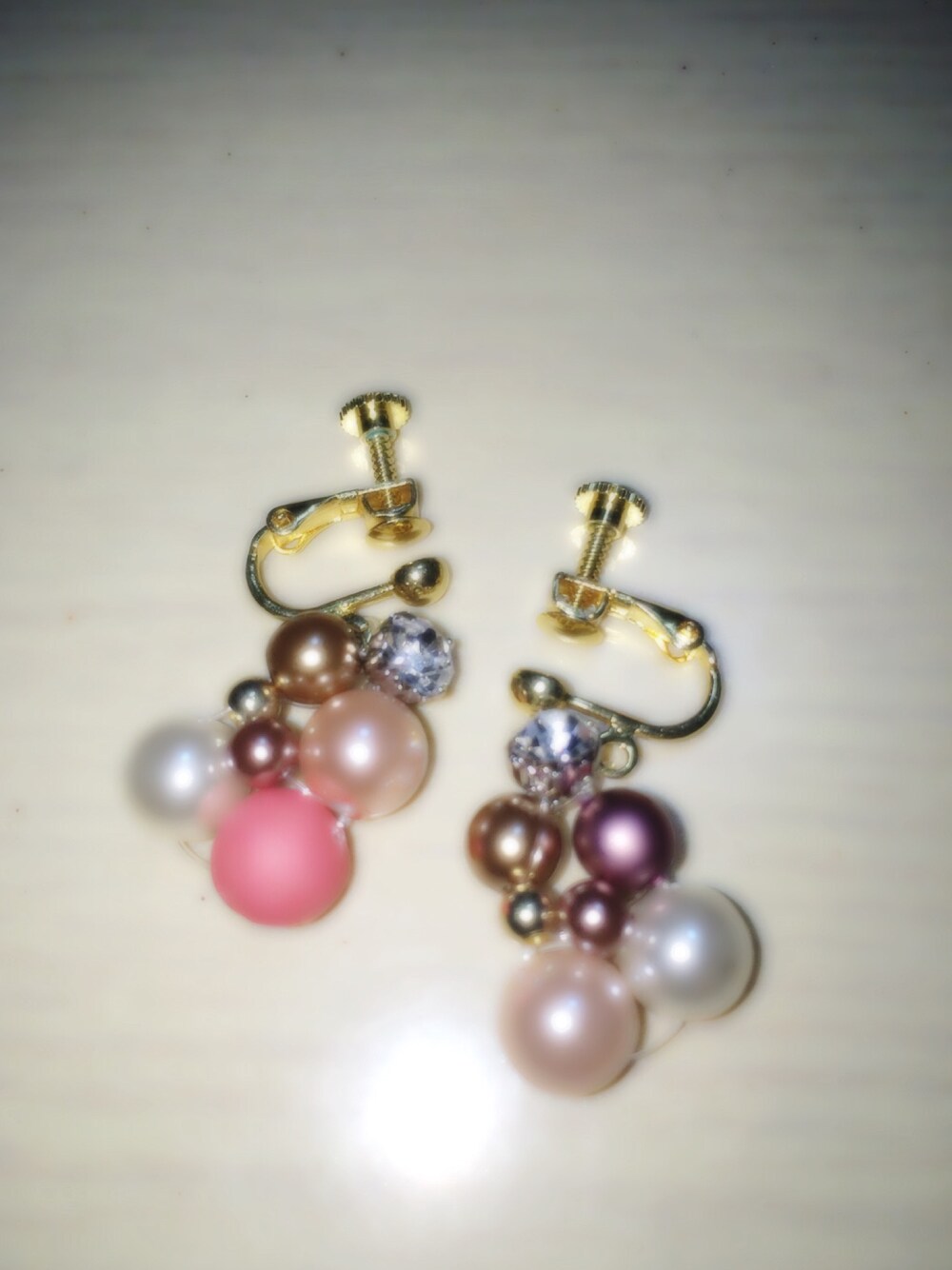 ピンク系のイヤリングを着用したレディースの秋コーディネートの1枚目の写真
