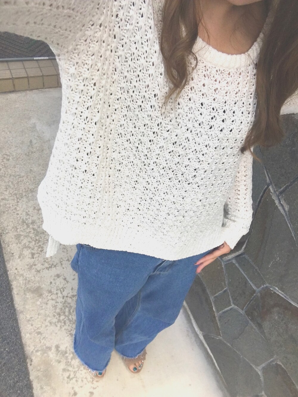 stussyのトップスをインナーに着て ゆるニットでチラ見せ的な 福島寒すぎてニット着なきゃ風邪引く