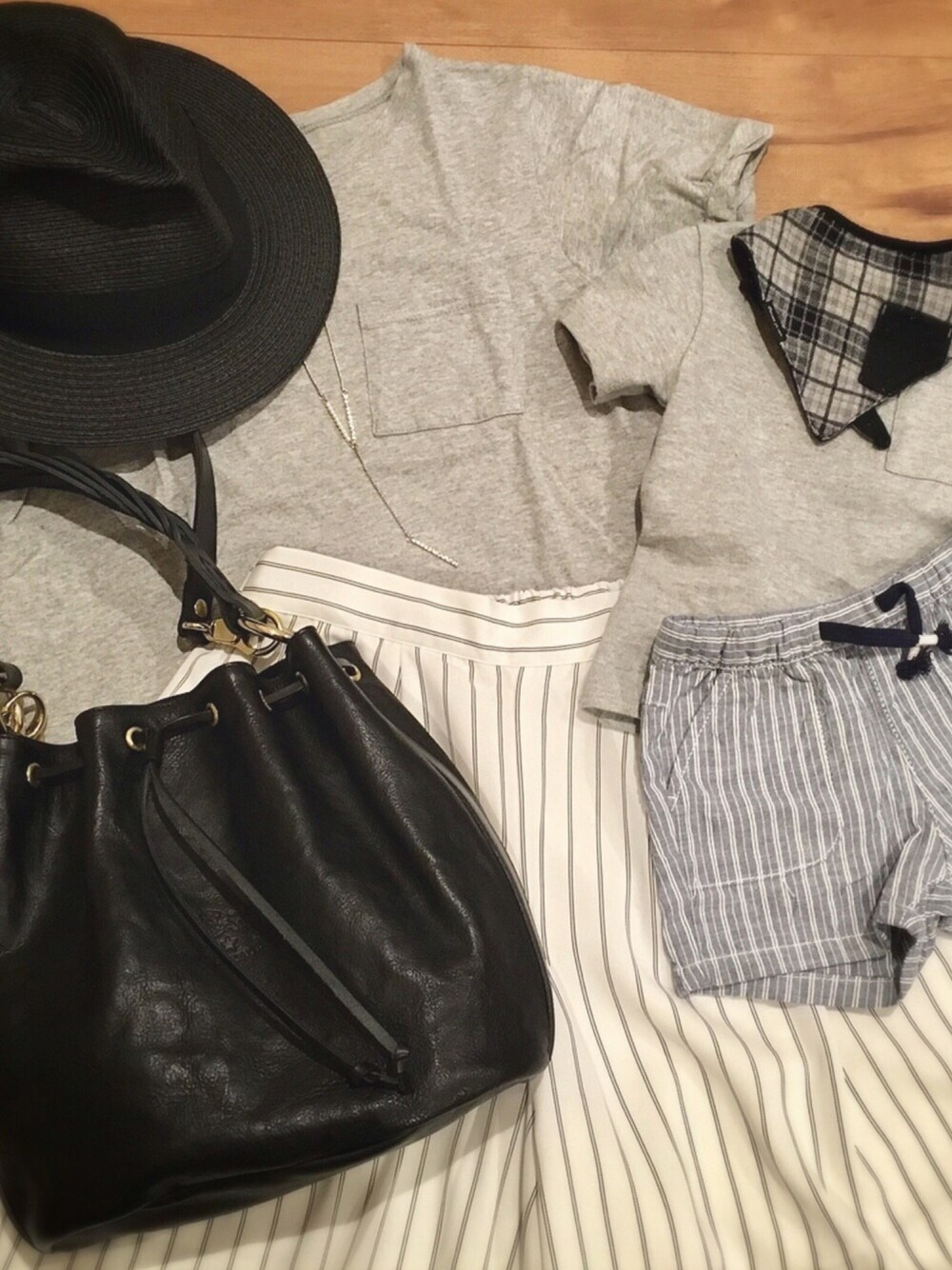 いつかの息子とのリンクコーデ♡︎ グレーTシャツ×ストライプボトムス×ブラック小物★★★ 今日は旦那な実家で焼肉〜( ˊᵕˋ ) 何着ようかな◡̈⃝︎⋆︎