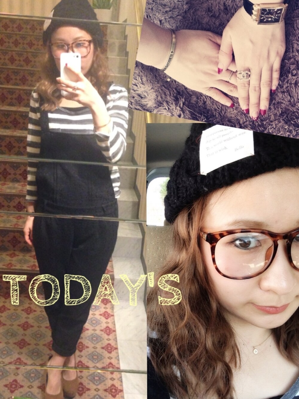 ロンT:H&M サロペット:Lowlys Farm ニット帽:インポート メガネ:雑貨屋 時計:DIESEL ブレスレット:イルビゾンテ 指輪:シャネル.4℃.jupiter.ete ネックレス:ungrid お友達とランチー♥ カジュアルスタイル‼ hairは、ウエーブウィッグつけた‼