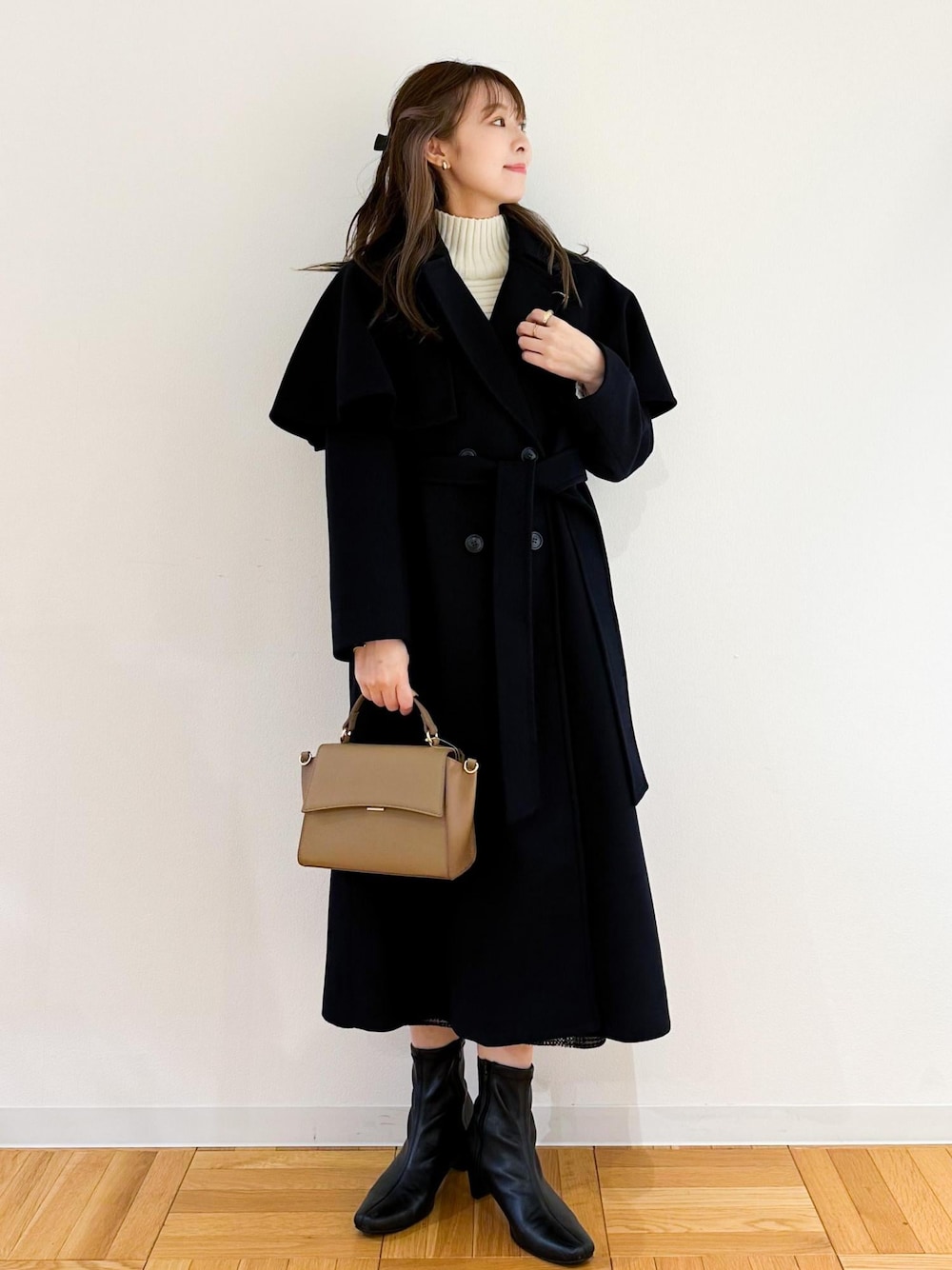 女性らしいコーデに仕上がるケープ付きのコート。 袖は細身なのでメリハリのあるシルエットで着用できます◎