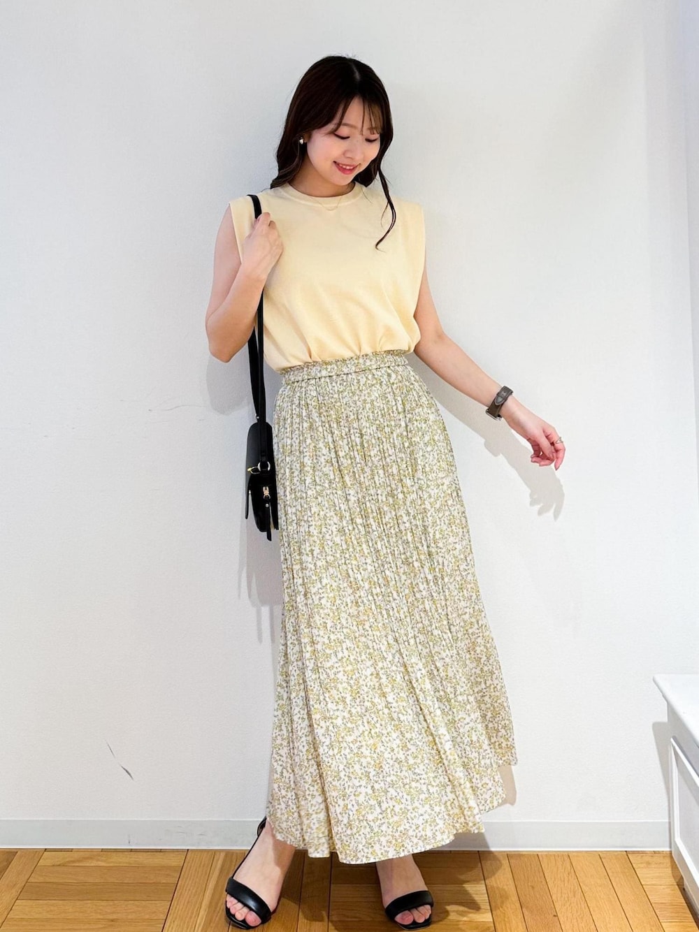 イエローカラーでまとめたワントーンコーデ。 小物はブラックでコーディネートを引き締めました◎