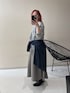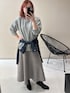 【トップス】 表面感のあるジャガード素材のトップスは、一枚で華やかさと上品さを演出してくれます。 肉感を拾いにくい適度な厚みがあり、体のラインを拾わずスッキリとしたシルエットを作ってくれました。 袖口のリブを少し上げて手首を見せることで、ボリューム袖の可愛さを引き立てつつ、抜け感を出しています。 【ボトムス】 程よく広がるAラインのニットフレアスカートは、気になる下半身を自然にカバーしてくれる頼れる一枚です。 あえて同系色のグレーで繋げることで、Iラインを強調し、全体をすらっとした印象にまとめました。 腰にネイビーのシャツを巻くことで、視線を高い位置に集め、腰まわりのカバーと脚長効果を同時に叶えています。 【シューズ・バッグ・小物】 ・足元は黒のスクエアトゥブーツでキリッと引き締め、モードなエッセンスをプラスしました。👢 ・重めのカラーでまとめる時は、足元にヒールのあるものを持ってくると、全体のバランスがグッと整います。 【スタッフのつぶやき】 ・のっぺりしがちなワントーンも、異素材の組み合わせとシャツのアクセントで、メリハリのある着こなしを楽しめました。