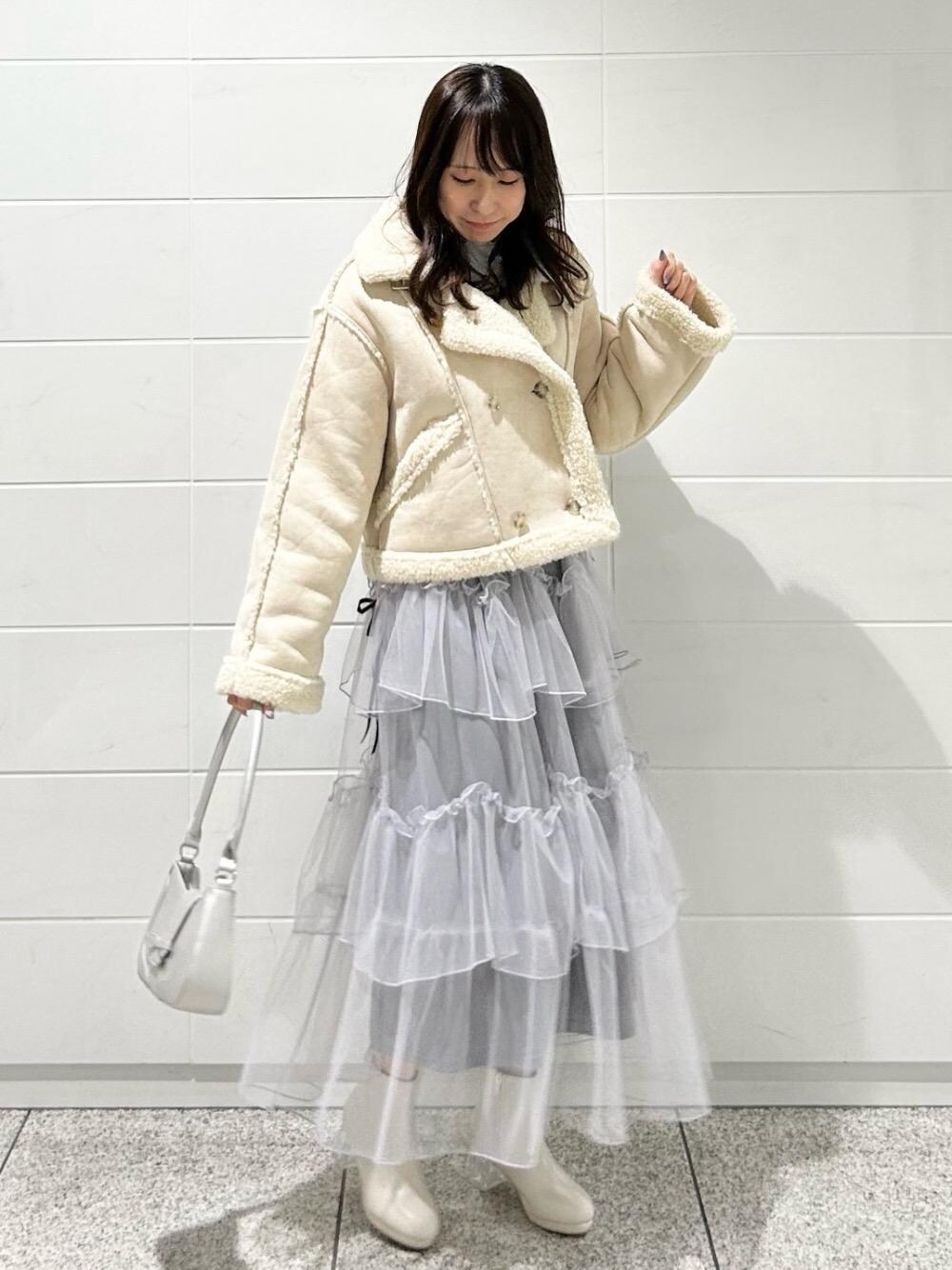モコモコのアウター♡個人的にくまさんアウターと呼んでます♡着丈も長すぎないので、ロングスカートとの相性も良いです🙆♀️スカートは新作で入ってきたばかりです🫶揺れ感が素敵すぎて、くるくるしちゃう🥰あーちゃんオススメスカート💕