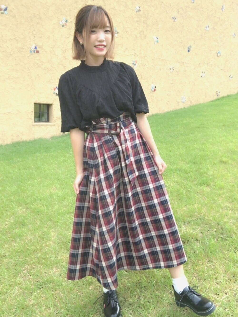 ボルドーのチェックのスカートが 秋らしくて可愛い! 黒のブラウスは袖口にシャーリング があるから伸ばしてもたくし上げても◎ レトロスタイル❤︎❤︎ インスタ→ aaayan_o