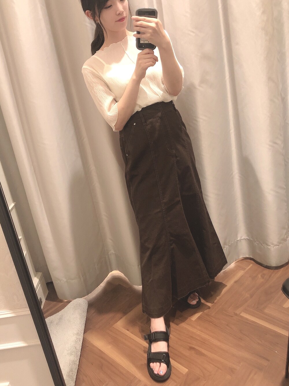 シアーが可愛いブラウスに ブラウンのデニムスカートで 大人カジュアルコーデ♡ サンダルにするとラフな感じで 良いです😌💘 インスタ→@aaayan_o