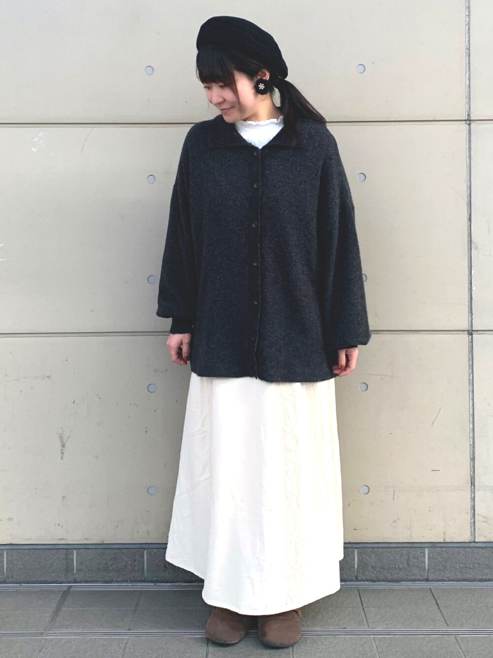 シンプルにモノトーンコーデ🐈⬛🐾 ブークレカーディガンは袖がぽてっとしていて可愛いです(^ω^) スカートはさり気ないレースがお洒落✨ 重ね着でペチコートとしても使い勝手良さそうです☆