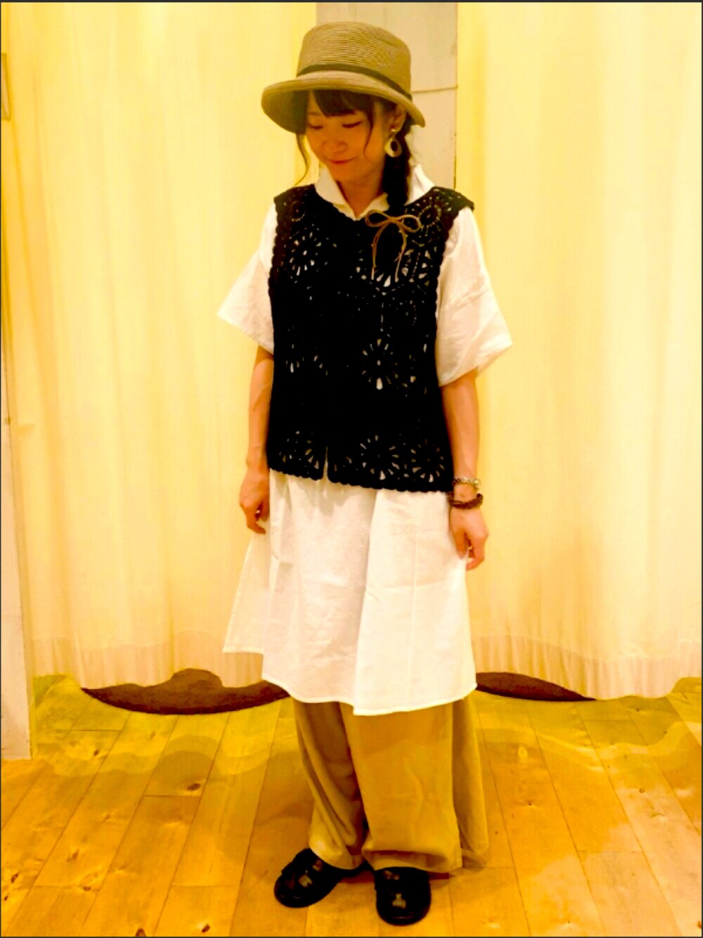 ナチュラルなスキッパーシャツに、人気のかぎ針ベストを合わせてみました⭐️ シャツの襟が可愛い♡ ゆったりしたシルエットでとっても楽チンです(*^^*)