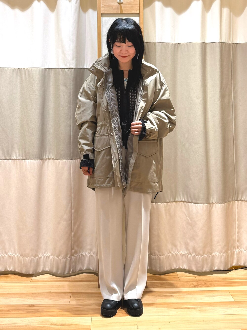 セレモニーにも使えるキレイめパンツとカジュアルアウターのMIX。 カーディガンはwジップでレイヤードしやすい⸜🌷︎⸝ アウターはフードがしまえるのが良き︎︎︎︎👍🏻︎︎ サイドのシルエットが綺麗です✨ 撥水加工もされてて安心🌧袖のマジテで 調節できるのも🍒◎
