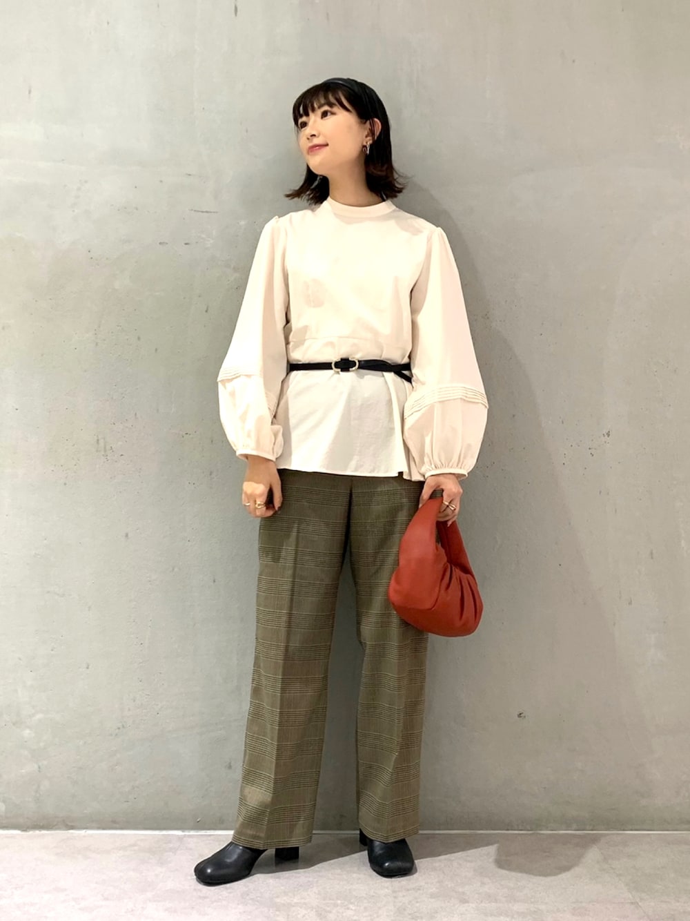 秋のクラシカルコーデ♪ 袖ボリュームペプラムブラウス No.GWH41530 ■162cm/38サイズ/骨格ウェーブ ■着用サイズ:38サイズ(フリー) 【サイズ感】 162センチで丈感はヒップが隠れるくらいでした。 程よいゆとりがあり袖周りもゆったりとしています。 【素材感】 シワになりにくい素材です。 かっちりし過ぎない適度なラフさがポイントです。 【着心地】 サラッと軽くとても快適な着心地です。 ヒップも隠れる丈感なので安心感もあります◎ ⭐︎スタイリングポイント⭐︎ 袖のボリューム感がトレンドでフェミニンな ブラウスを主役にチェックパンツを合わせ、 秋のクラシカルなコーディネートにしてみました♪ 差し色に赤バックを合わせたのもポイントです☺︎