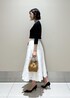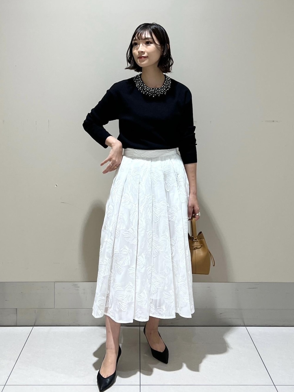 胸元の華やかなパールニットをメインに、フレアスカートを合わせ、新年会のキレイめコーディネートにしてみました! パールが華やかなので、ネックレスいらず、生地感もとても柔らかいので着心地抜群です◎ ぜひ、新年会や、きれいめスタイリングなどの時に参考にしてみてください♪