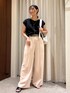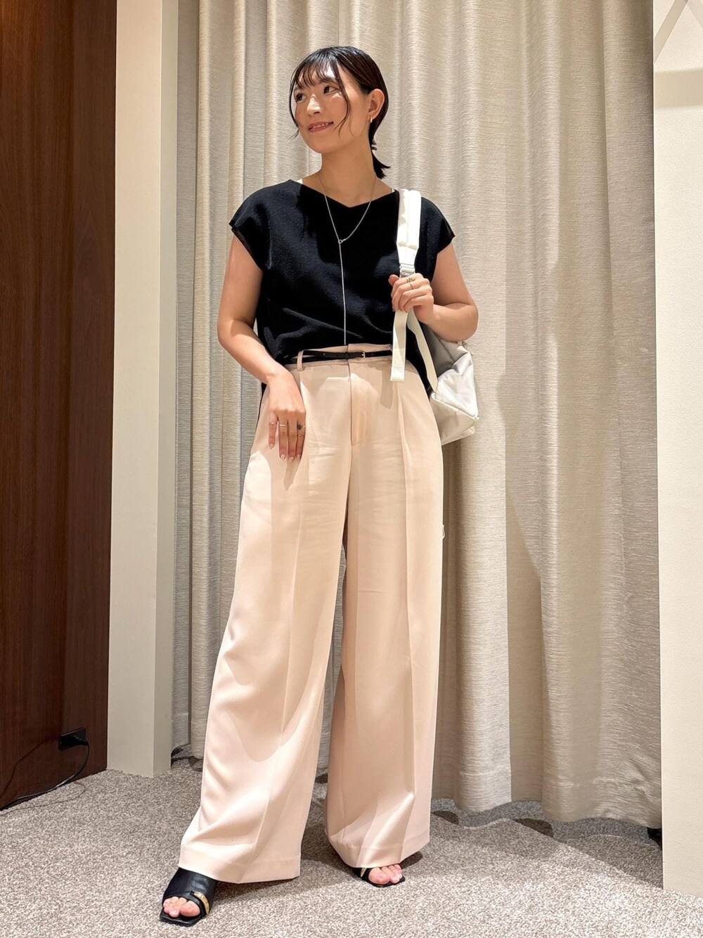 細やかなラメのトップスに柔らかいピンクのパンツを合わせ 夏のおすすめ通勤スタイリングに仕上げてみました♪ ホワイトのリュックをアクセントに!