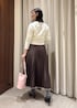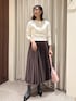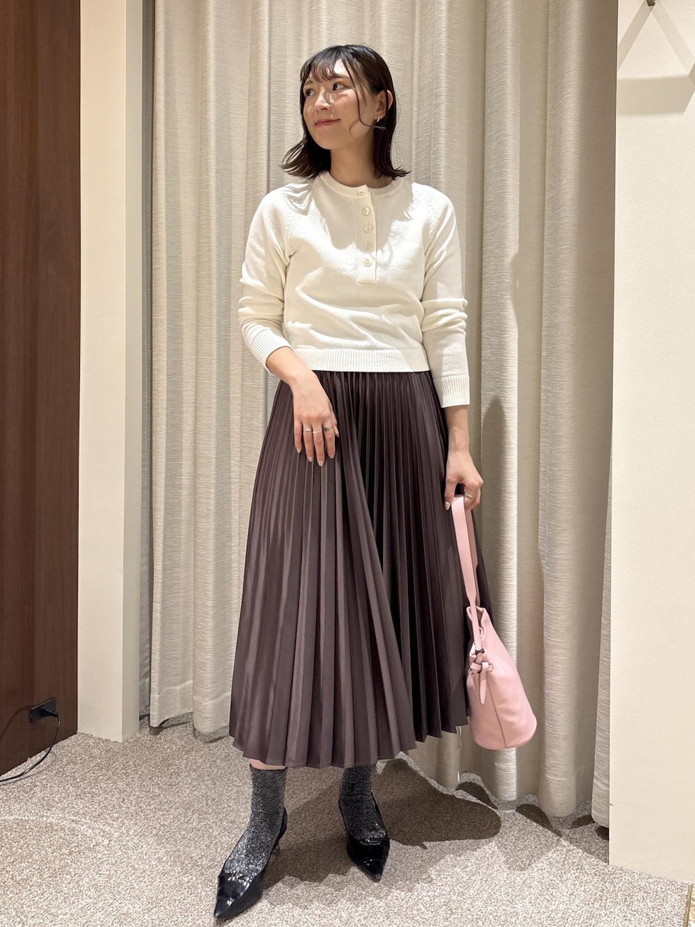 春にちょうどいいミドルゲージのニットに、 光沢感の綺麗なプリーツスカートを合わせてみました! ぜひ参考にしてみてください!