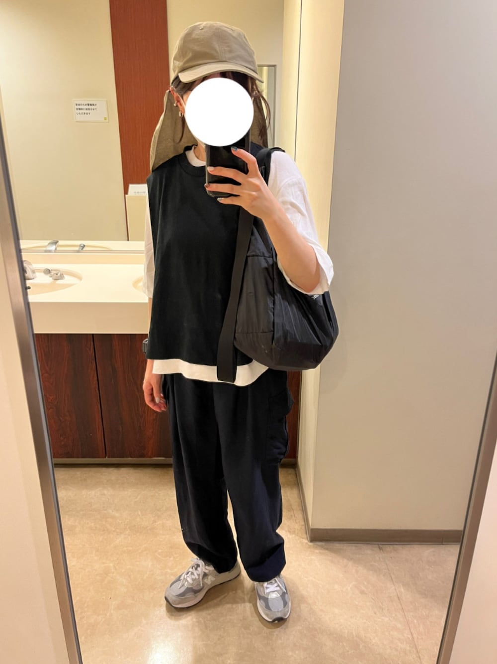 帽子で首を守りサングラスをかけ日傘をさしています