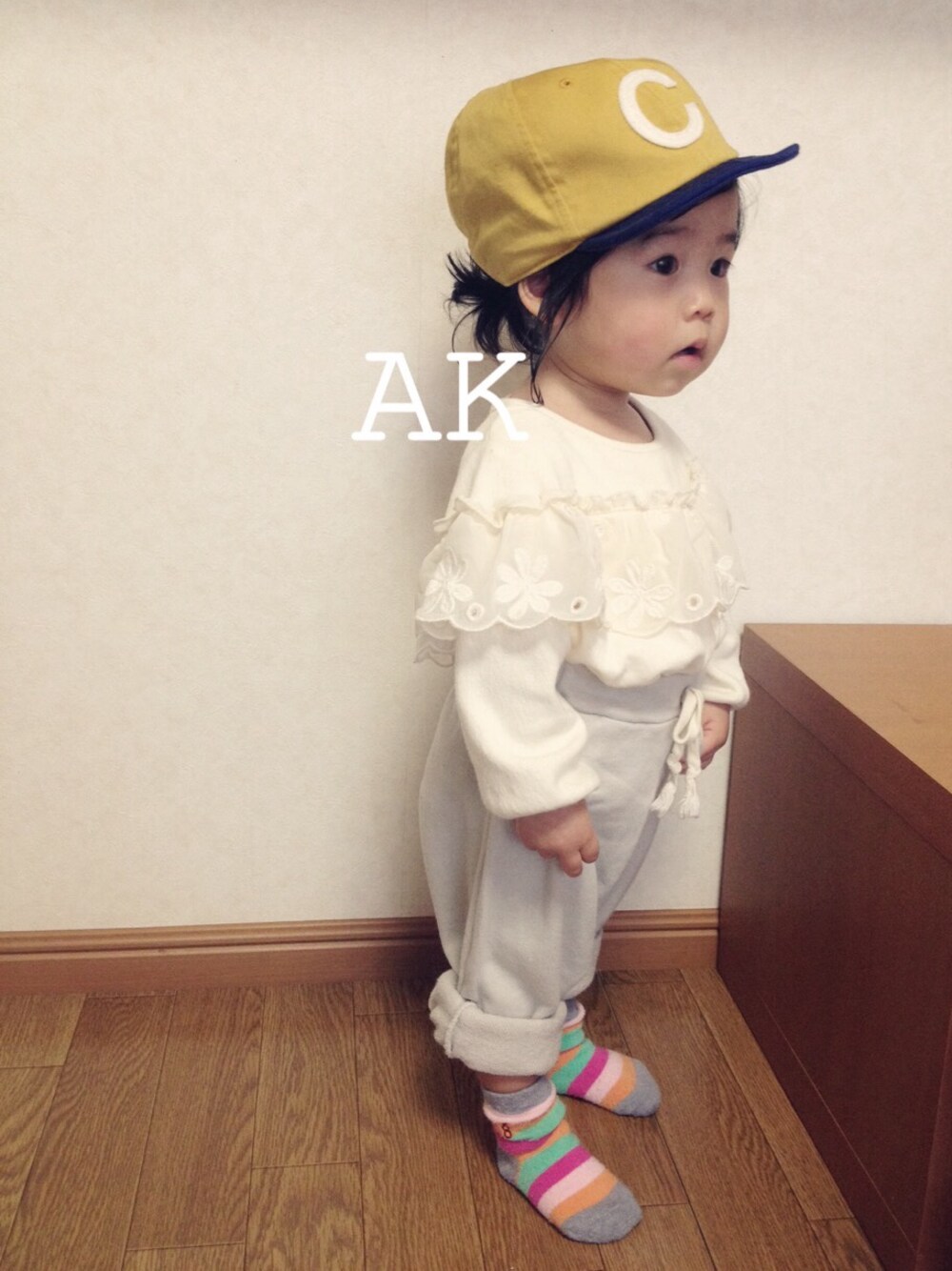 キャップ : HAT HOMES スウェットパンツは大きすぎて 4回くらいロールアップ。笑 出産祝いでもらってた靴下は今がぴったり♡ カラフルで可愛い♡꒰ ´͈ω`͈꒱ キャップと靴下がアクセントʕ•̀ω•́ʔ✧