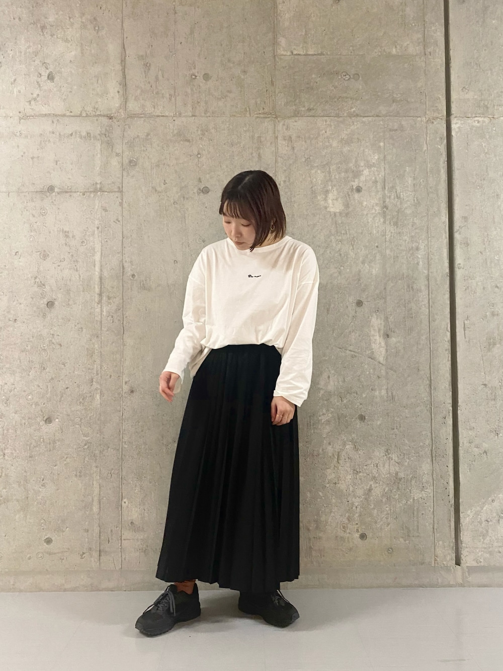 シンプルやけど モノトーンコーデおしゃれですよね🦨🤍 プリーツスカートも スニーカーとロゴカットソーでカジュアルに💓
