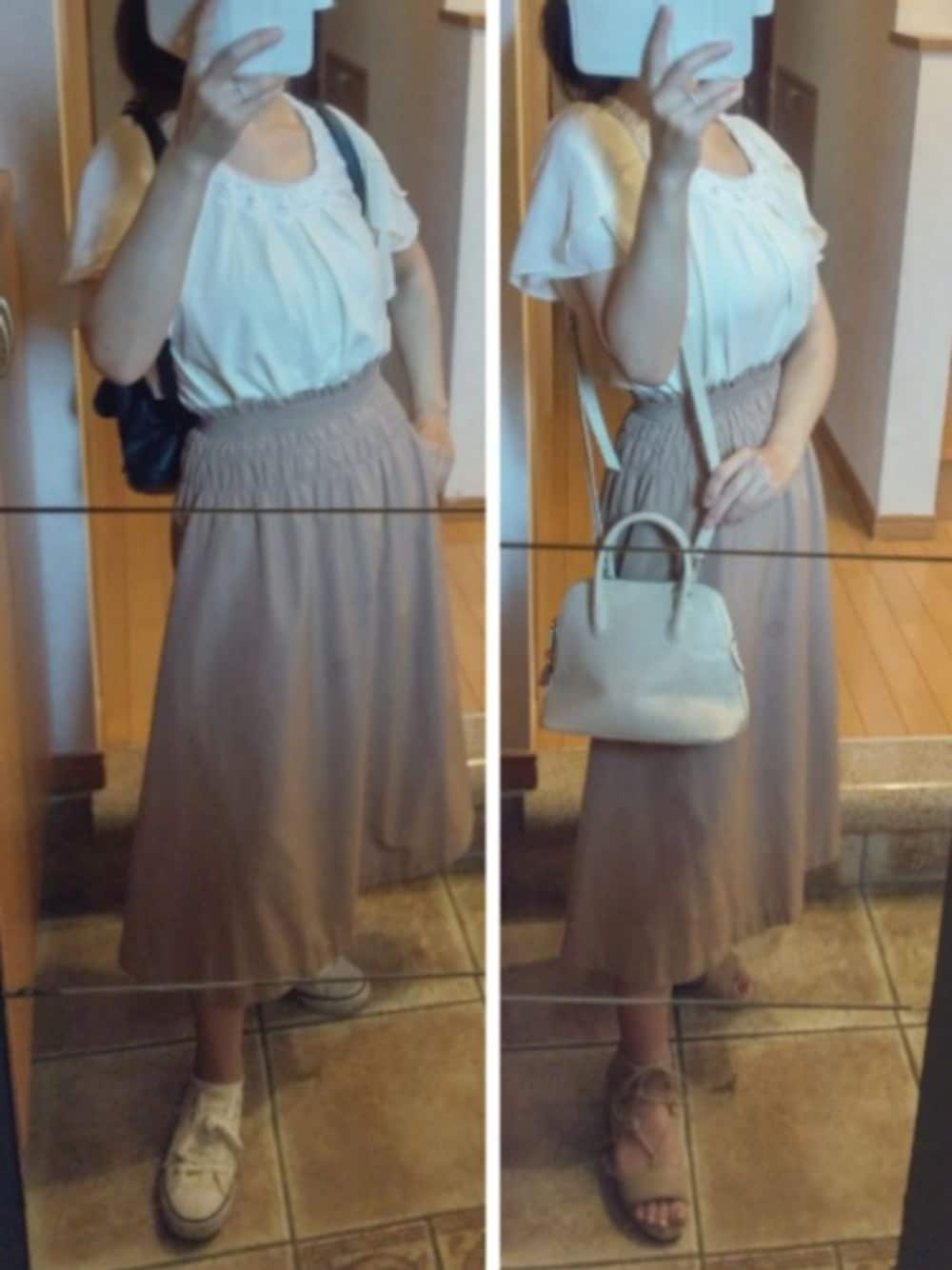 フリルトップスにフレアスカート。 ワントーンでエレガント路線、スニーカーとリュックのカジュアル路線、どっちにしようかな。
