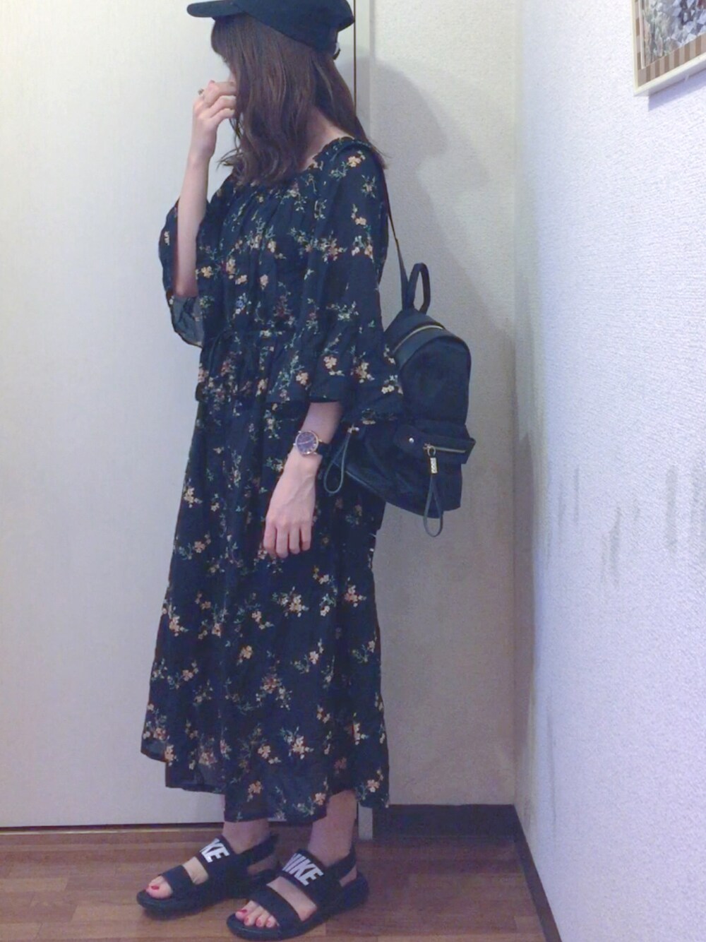 お友達とお出掛けしたときのコーデ。 動きやすくて涼しい WEGOの花柄ワンピースと👗 足が全然疲れない NIKEのタンジュンサンダルで行きました👟