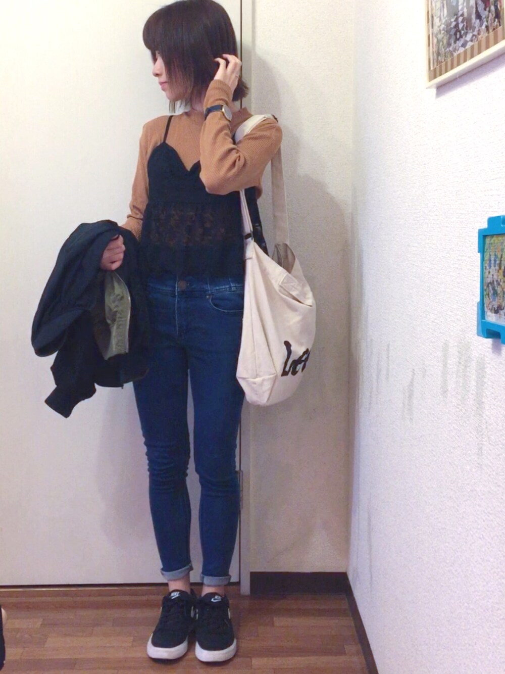 ちょっとそこまでコーデ☕ デニムで楽チンです。 リブTにビスチェを重ね着しました☺️
