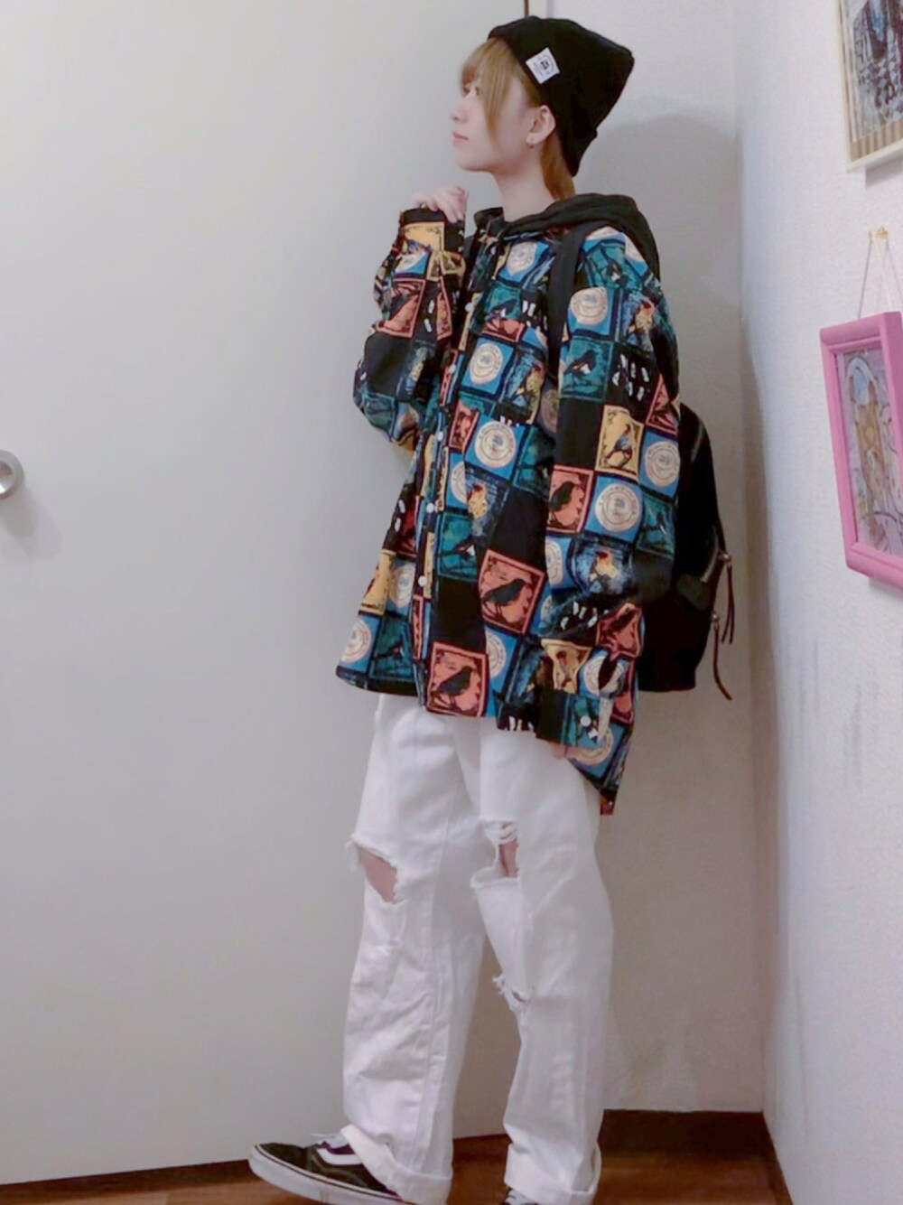 地元の服屋さんで一目惚れした 鳥さん柄🐦のカラフルなシャツが カッコよすぎて可愛すぎて事件🐦 個性的なアイテムだけど 頑張って着まわしたいところ🐦 この日のファッションのテーマは 「街とかで絡んできたら面倒臭そうな感じの人」です。