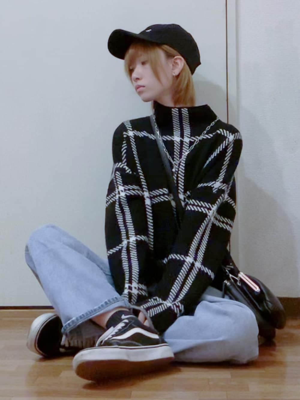 寒いのでダウン羽織りました☃︎ チェック柄のニットとてもよき☺️ なんか全部ふてくされたような顔してますが 怒ってません( ˊᵕˋ )
