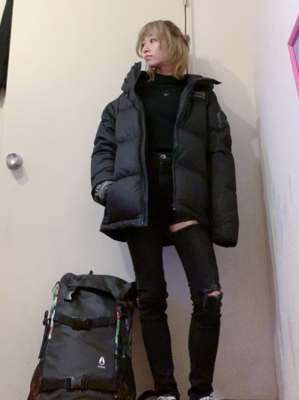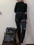 EMODAのスキニーパンツ 古着屋さんで500円くらいでした。 上の方まで破けてて可愛い。 こういうの欲しかった😚 オールブラックの気分でした。 角度ミスって足元映ってないし ピントが微妙に合っていない₍ ᐢ. ̫ .ᐢ ₎